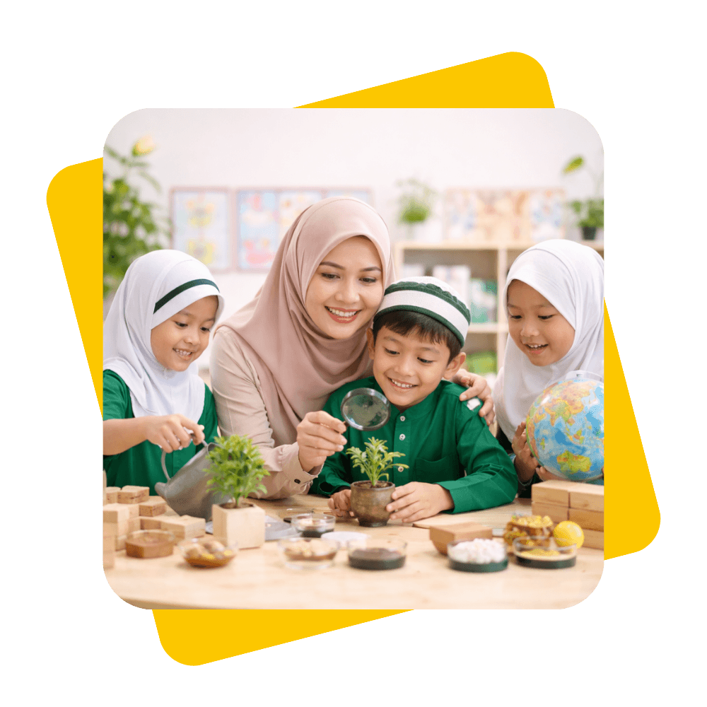 Melalui Play-Based Learning, Inquiry-Based Learning, dan STEAM Approach, anak diajak belajar secara aktif lewat pengalaman nyata yang menyenangkan dan bermakna. Sementara itu, National Curriculum memastikan setiap proses perkembangan tetap terarah, dan Islamic Values menjadi fondasi dalam membentuk adab, akhlak, dan karakter anak sejak dini.
